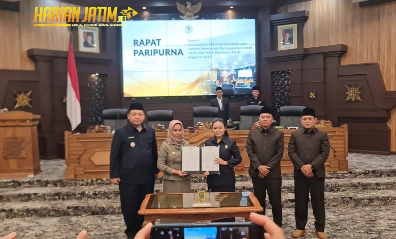 Mojokerto, harianjatim.net – DPRD Kota Mojokerto menggelar rapat paripurna dengan agenda penyampaian rekomendasi atas Laporan Keterangan Pertanggungjawaban (LKPJ) Wali Kota Mojokerto Tahun Anggaran 2025, Rabu (8/4/2026), di ruang rapat Gedung DPRD Kota Mojokerto. Rapat paripurna dipimpin Ketua DPRD Kota Mojokerto, Ery Purwanti dan dihadiri Wali Kota Mojokerto Hj. Ika Puspitasari, SE, Wakil Wali Kota, jajaran Kepala Organisasi Perangkat Daerah (OPD) dan Forkopimda Kota Mojokerto.