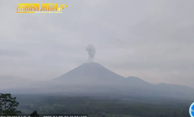 Lumajang, harianjatim.net – Gunung Semeru yang berada di perbatasan Kabupaten Lumajang dan Malang, Jawa Timur, mengalami empat kali erupsi dengan tinggi letusan berkisar antara 800 meter hingga satu kilometer di atas puncak pada hari Kamis, 9 April 2026.