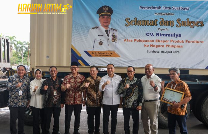 “Banyak orang bertanya, bagaimana pergerakan industri di Surabaya? Hari ini kita buktikan. Total yang terkirim untuk ekspor hari ini mencapai 2,7 juta dolar Amerika. Ini angka yang sangat besar dan jauh melebihi apa yang kita targetkan,” ujar Eri Cahyadi saat pemberangkatan ekspor di Grand City Convention Hall, Surabaya pada hari Sabtu, 11 April 2026.